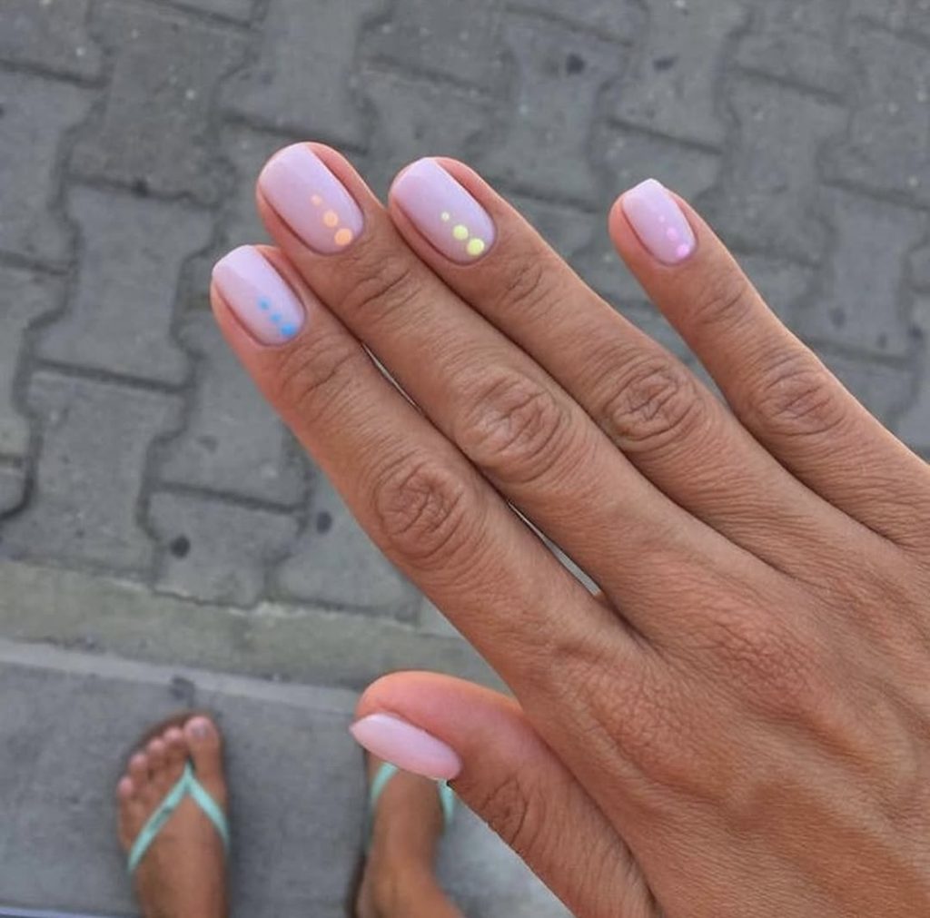 A fresh take on short square nails, this look layers a glossy lilac base with evenly spaced pastel dots in pink, orange, yellow and blue. The elegant color combination creates a captivating beach party look, with the dot formations maintaining stability and a dynamic flow throughout the design. It’s an ideal simple nail design for women who love a little color coordination without overthinking.
