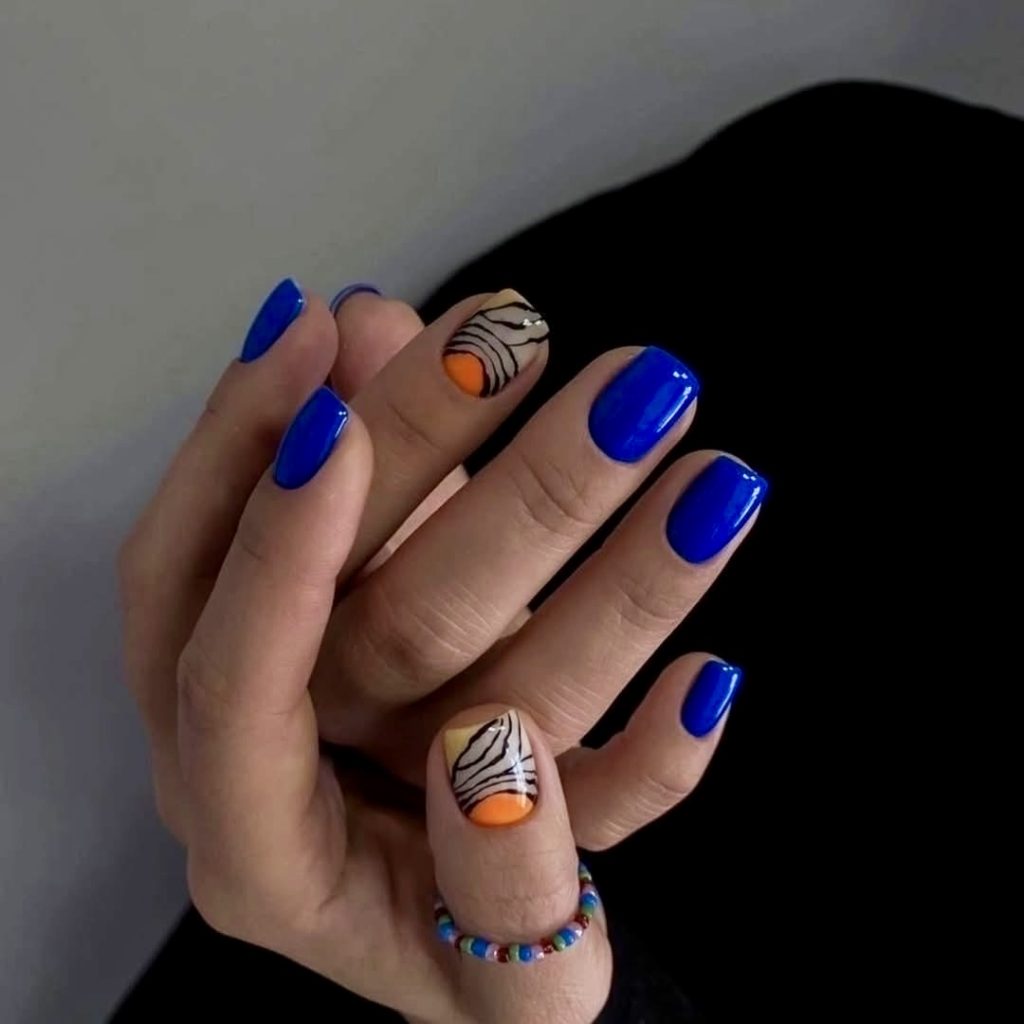 This electric blue manicure is a bold choice for those who want their nails to do the talking. The vibrant color creates an immediate impact, yet the graphic 2025 almond simple art on accent nails with black lines drawn over a warm orange nail surface creates the most powerful visual effect, resembling waves next to a sunset. It’s a creative balance of high fashion and summer fun, ideal for rooftop parties and art gallery strolls.