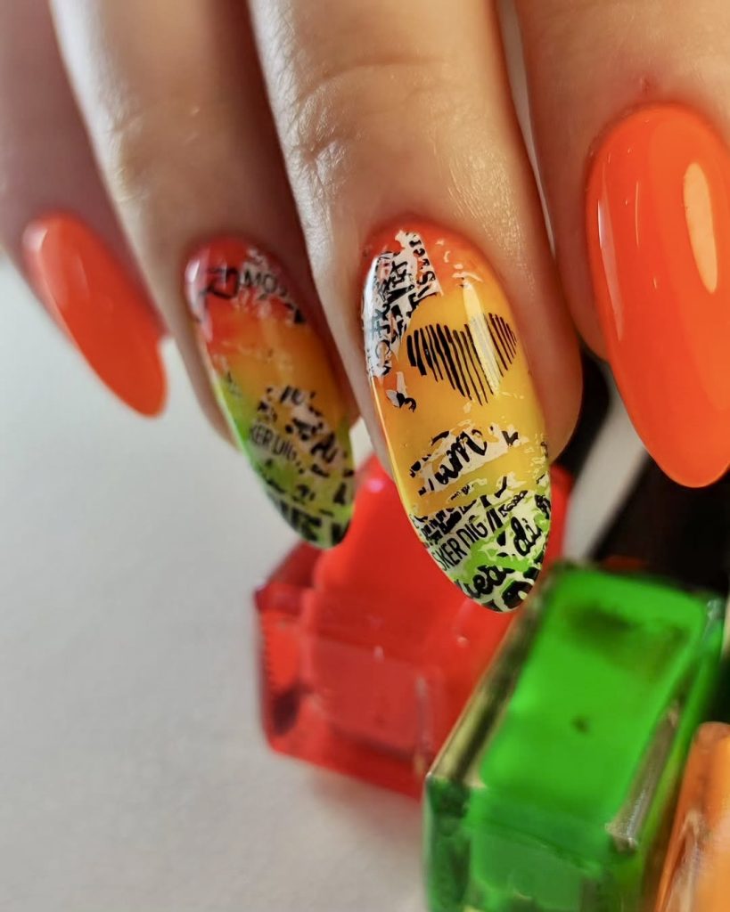This gel nail set is inspired by pop art and summer streetwear trends. The combination of orange.orange, lime.yellow and yellow along with black heart graphics and edgy lettering creates a vibrant, expressive atmosphere in this design. A rectangular almond design brings sophisticated elegance to the rough edges, resulting in a fashionable blend of rebellious and glamorous elements. This is for the trendsetter who doesn’t mind being noticed.