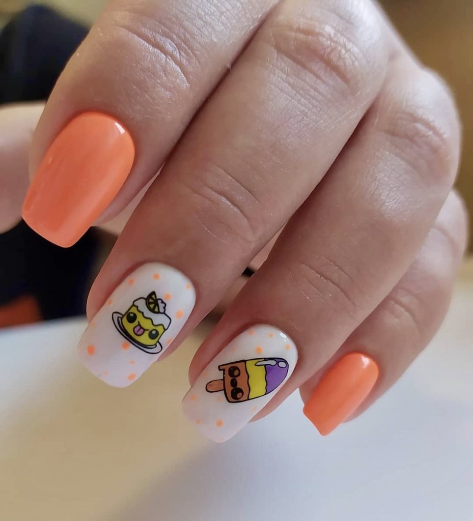Nothing says summer 2025 like playful nail art featuring delicious desserts. Short square manicures showcase the combination of foam orange polish with lemon cake and popsicle images on a white background. Accented with soft dots for added depth, this fun and simple design is perfect for beach trips, ice cream dates or anyone who likes a dose of whimsy in their beauty routine.