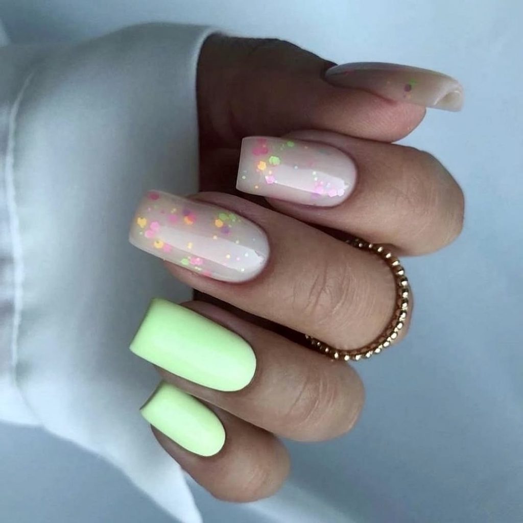 If you’re drawn to fun contrasts, this 2025 short look will capture your heart. The design blends retro nostalgia with a contemporary edge by applying a soft neon green matte polish to two nails and a translucent pink shimmer covered in multicolored confetti dots to the others. It’s a simple, low-maintenance choice that looks great against sun-kissed skin – think beach days or Sunday brunch with mimosas.