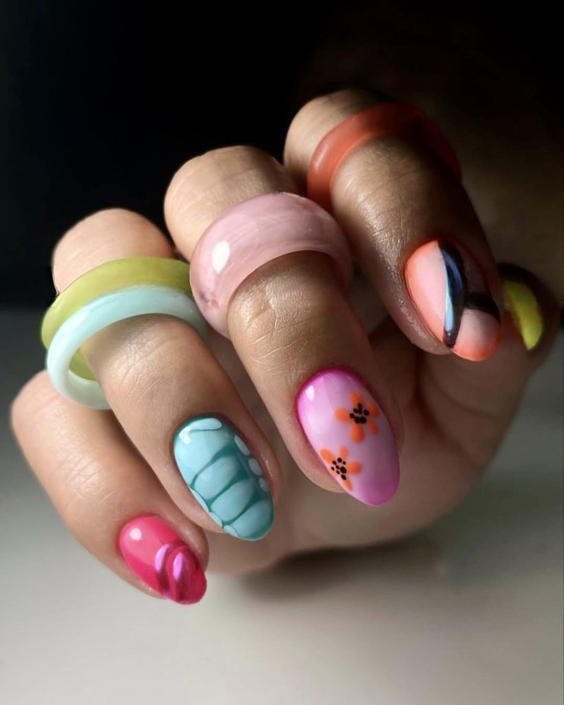 This colorful set is the perfect example of a fun, expressive look for 2025. Different artwork appears on each nail as it features abstract swirls and miniature orange flowers along with a striking gel aqua effect that mimics crocodile skin. The uniqueness of this nail design comes from its refusal to obey rules as it embodies true charm. Those who combine artistic talent with the need for stylish yet simple nails will appreciate this look. It’s a 2025 almond look that reflects individuality and playfulness, ideal for summer outings and spontaneous vacations.
