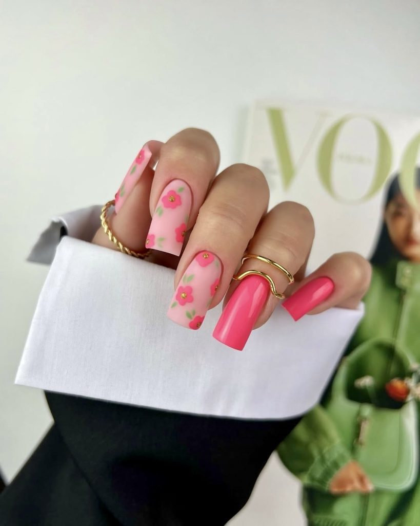 Romantic and delightfully fresh, this soft pink manicure brings a floral fantasy to life. The soft touch of red flowers combined with green details gives this set a sophisticated summer nail art look. The square nail structure maintains a contemporary design, although simple floral patterns from the 2025 fashion year ensure it works for both daytime events and evening garden receptions. It’s a sweet and simple idea for those who love a soft, feminine vibe.
