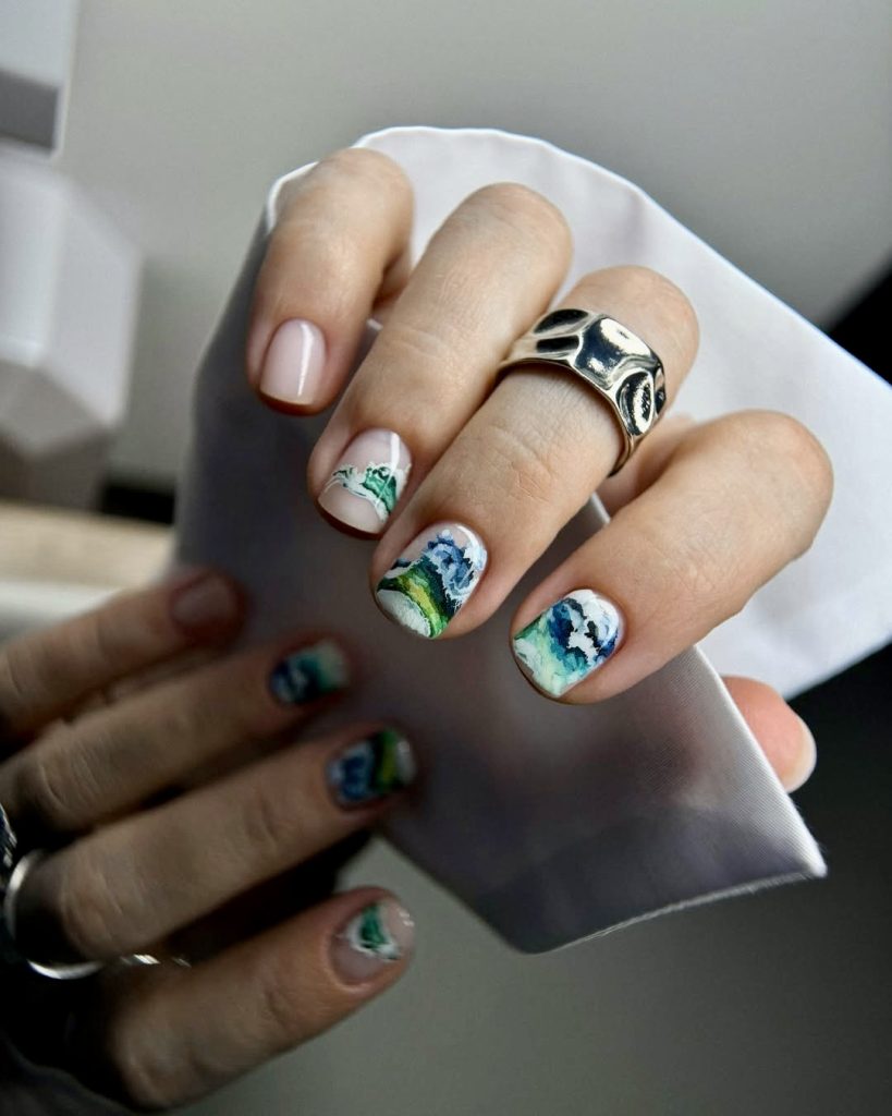 This hand-painted design is nothing short of wearable art. The painters have created undulating underwater landscapes that showcase crashing waves and lush green coastal areas, celebrating nature through this masterpiece. Among 2025 almond short simple manicures, this model stands out as one of the most imaginative choices. For art lovers, nature lovers, or anyone who wants to take the beach with them in a truly original way, this set delivers soul and sophistication.