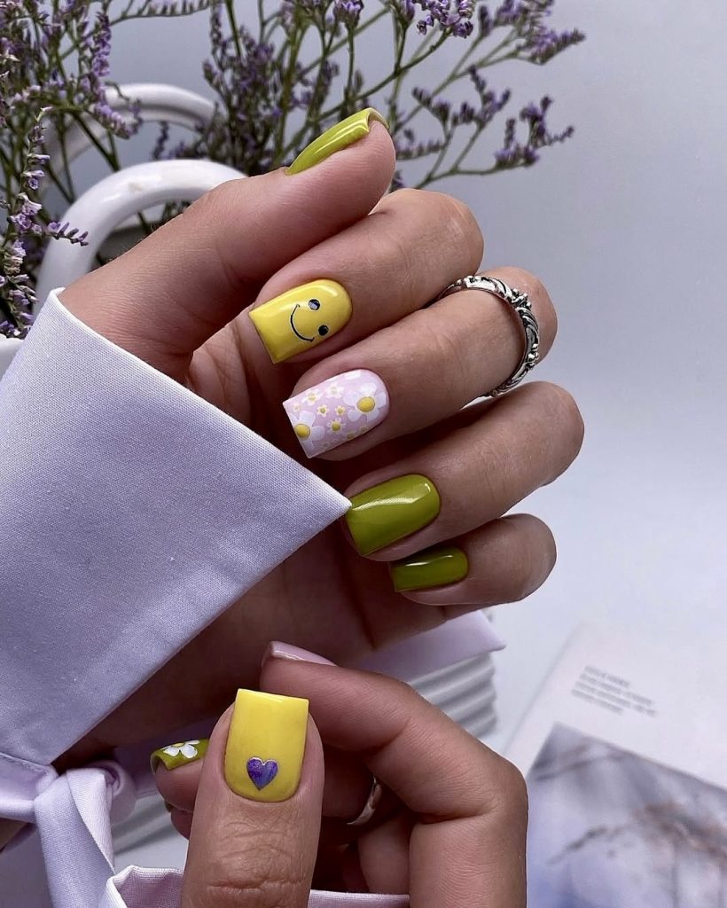 Bright yellow, playful smiley faces and a tiny purple heart – this manicure is all about joy. The manicure transitions from solid green to dotted pastels and ends with cheerful icons that perfectly represent the positive fashion sensibility of summer 2025. The square length makes this style dedicated to practicality, yet it brings vibrant fun to any nail design. It’s a mood booster in manicure form, ideal for the 2025 short nail lover.