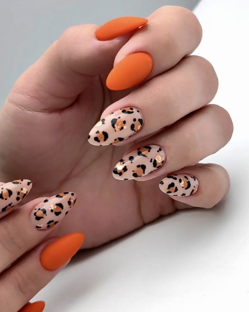 This fiery orange and leopard print combo makes a bold statement for summer 2025. The accent nails swirl soft nude polish together with black and copper dots for a safari-chic style that stands out against the matte almond nails painted in bright orange. People who want exciting nail art combined with golden summer vistas should consider this manicure option. This look screams coffin short bright color with a wild twist.
