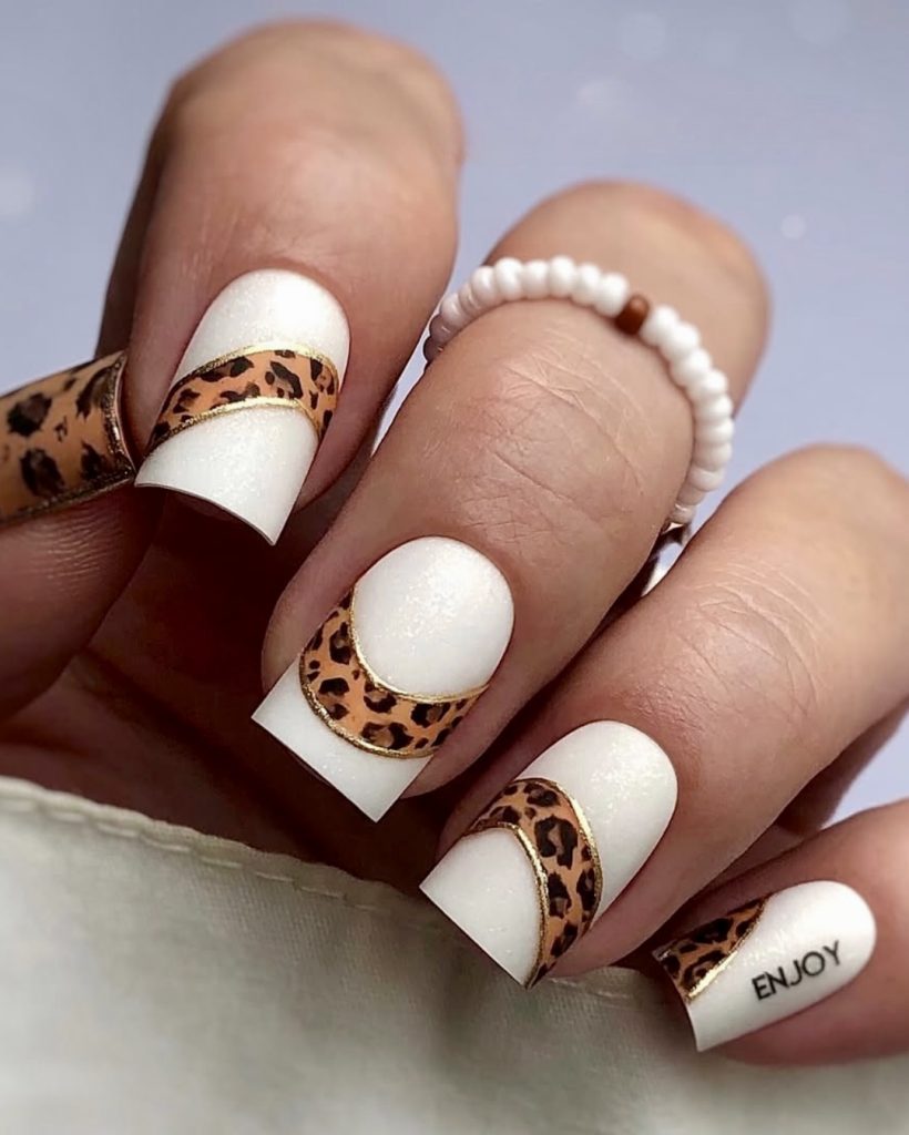 This square nail set combines clean white polish with curved leopard-print bands outlined in fine gold for a luxurious take on the French tip style. This nail design offers the stylish charm of a simple 2025 approach along with bold personality features, perfect for women seeking a sophisticated look. The addition of a small “ENJOY” text detail gives it a personalized, high fashion finish.