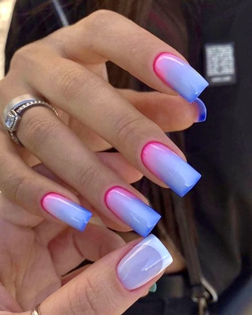 If you’re dreaming of the ocean, this aura-inspired look will take you there. The square nail design creates a vibrant, gel-like effect as blue and pink hues transition in soft gradients. This nail design has a glossy finish that will enhance both casual and formal summer outfits. A stunning example of the 2025 square trend with beach vibes baked right in.