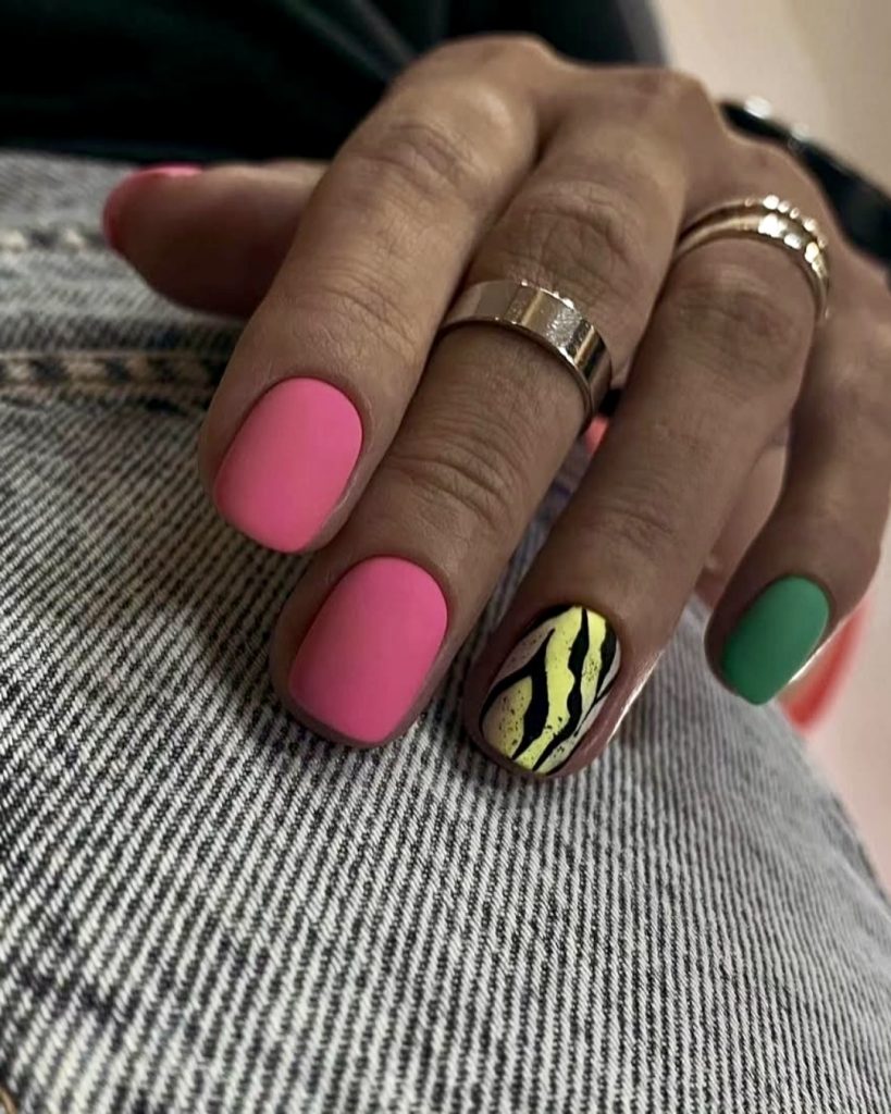 Minimalist meets edgy in this bold nail look. A dark abstract animal pattern in black stands out against the well-matched matte pink and green nail polish on most of the digits. The accent nail combines yellow and black. This nail style represents an attractive fusion of aggressive aesthetics and modern fashion. Ideal for those who want a simple, expressive look that’s just right for denim days or street style moments in 2025.