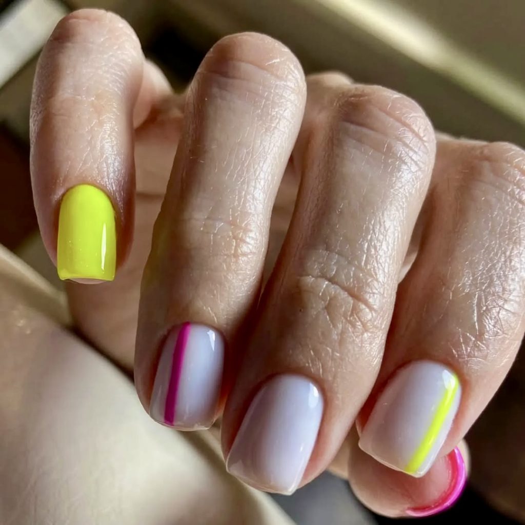 This sleek, short design gives modern minimalism a summer glow. Each nail blend has a different look, with a full yellow nail juxtaposed against clear nails with straight upright pink and yellow lines or borders. It’s simple but never boring. This nail style feels clean, editorial and totally in line with the 2025 short nail trend.