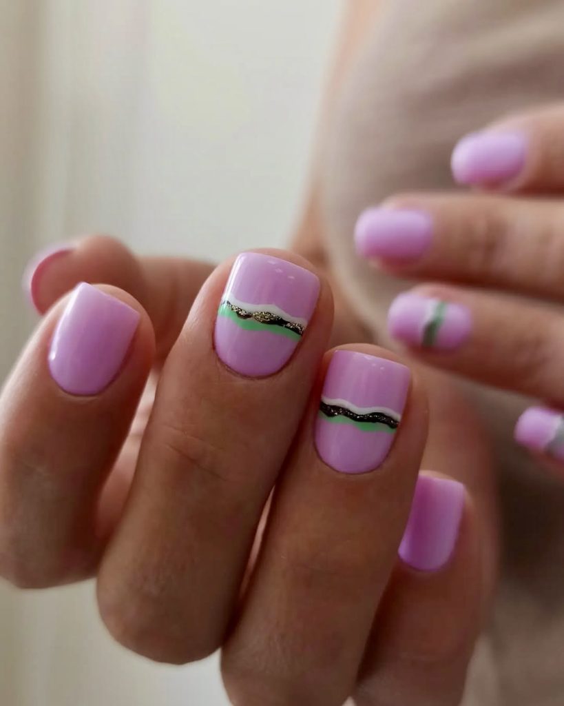 Romantic yet sophisticated, this gel manicure combines soft lavender with a metallic wave across the center. The wave, introduced by gold and green elements, creates subtle shimmer and contrast effects without distorting the primary color. The design provides a look suitable for summer weddings, but also for any special brunch event. A beautiful, wearable example of a 2025 almond short, simple manicure that feels fresh and a little elevated.