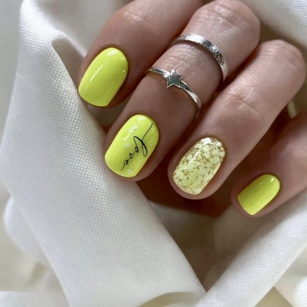 This radiant set takes the idea of the 2025 almond short and gives it a golden upgrade. Most of the nails feature a bright yellow base, but one nail shines differently by using metallic foil to create a luxurious texture. A single nail features a delicate script that reads “Love,” adding a personal, romantic touch. It’s cheerful, elegant and perfect for summer celebrations.