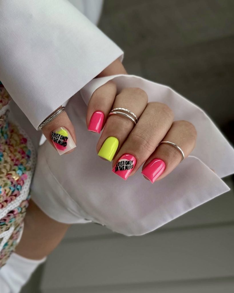 Fun and fearless, this design mixes pink, yellow and message stickers to create a manicure that speaks for itself. Each nail is shiny and short, with alternating blocks of color and minimalist phrases like “Resist Only the Fake Mind” giving it a punch of attitude. Perfect for fashion lovers who want their 2025 short nails to stand out with a statement.