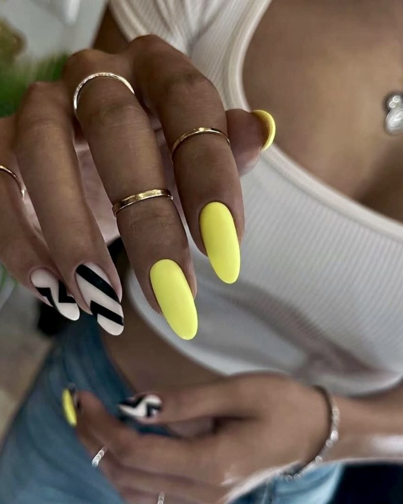 For fans of contrast, this almond nail design is a summer dream. The clear choice is matte yellow nails, accompanied by a few strategically placed black and white chevron patterns that bring an innovative edge to this aesthetic. It’s a bold and graphic interpretation of 2025 almond simple, combining boldness with editorial flair.