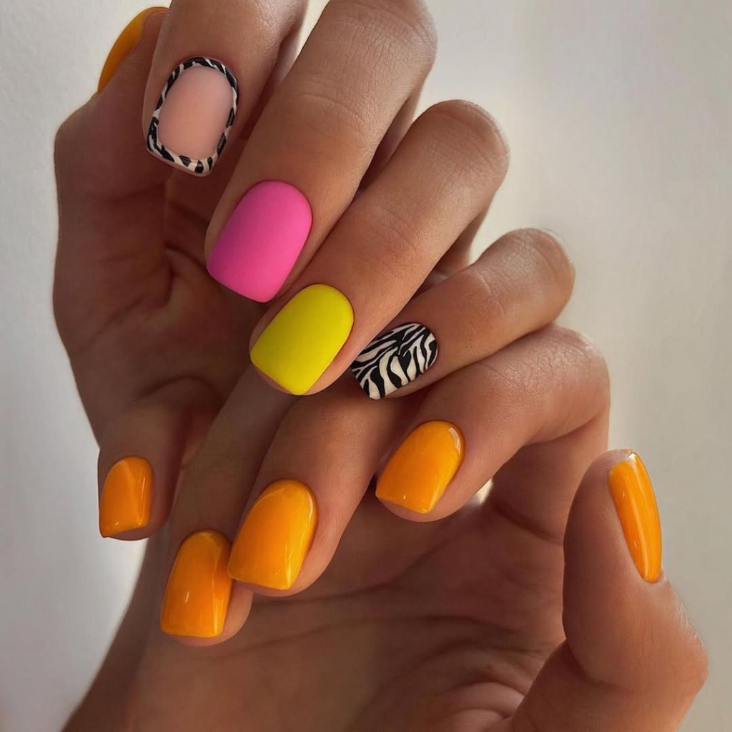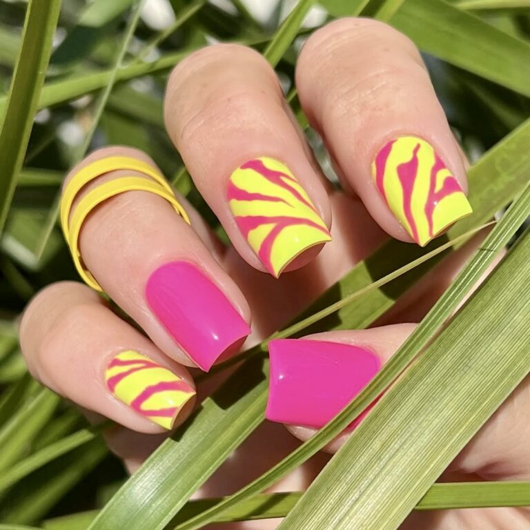 This vivid pink and yellow nails are a hit when you are ready to maximize the heat and light of the summer 2025. Showing a combination of the plain neon pink nails and the yellow nails with pink tiger stripes, this design trends wild, young, and energetic. A square shape brings the structure to the bouncy playful vibe, and it is the perfect design for colorful tropical vacations or fun beach days. If you are the type of person who likes to get attention and show your adventurous spirit through fashion, then this nail art is.