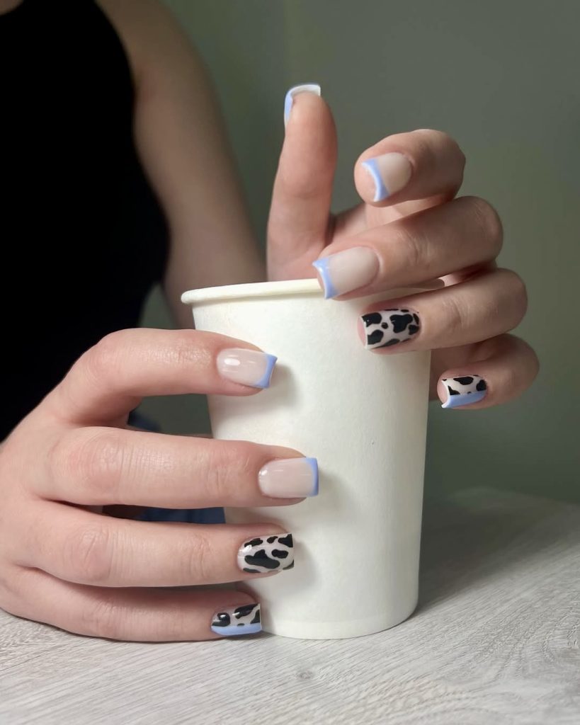 2. Modern Cow Print and Blue French Tip Combo