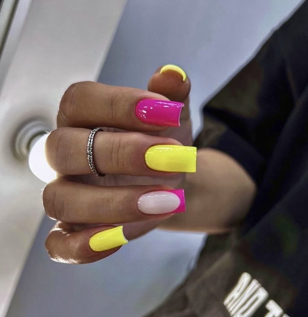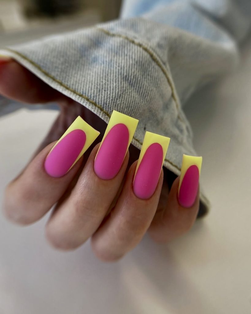 5. Neon Pink and Yellow Geometric Nails