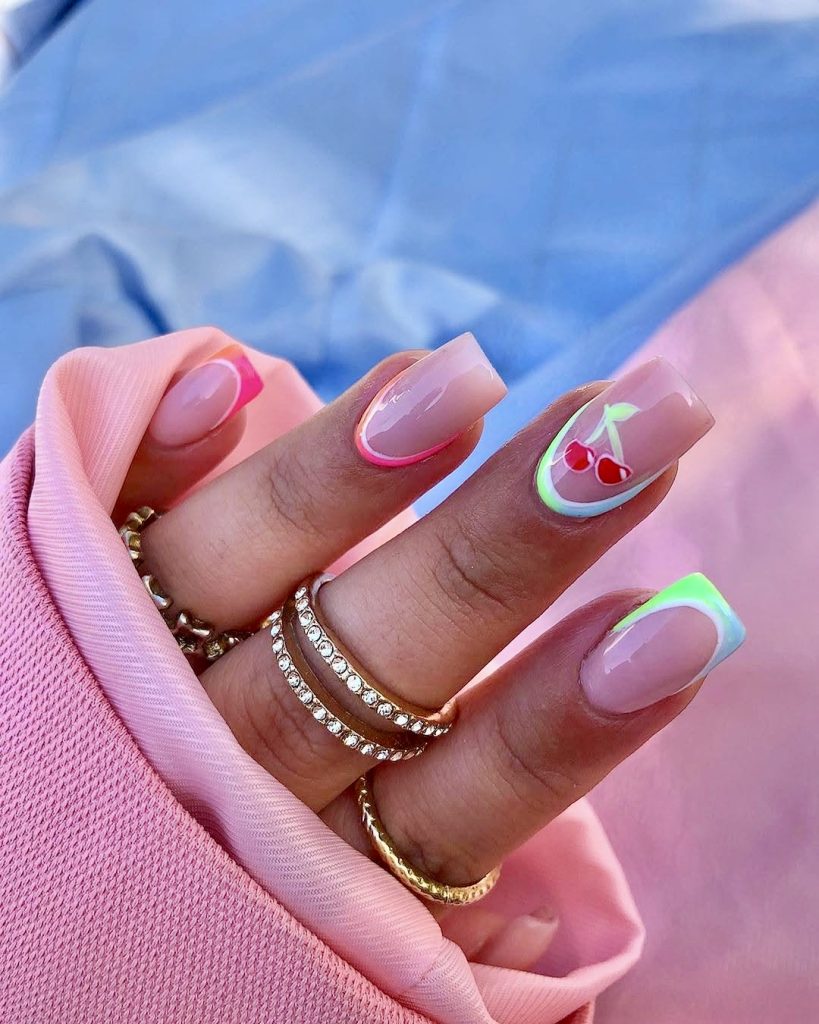 This minimalist design infused with a hint of sweetness is really subtle. It combines fluorescent neon french tip with a cute cherry motif on the ring finger. The soft cherries on the glossy nude base make for a very flirty and yet tasteful look, absolutely perfect for the spring and the early summer picnics or strolls through farmer’s markets. The medium-length square shape helps to stay modern and wearable, and the details of pink and green make it look beautiful and fresh. It is a style that seems so naturally American, evocative of diner chains and summer narratives. Completely different, yet equally beautiful. Time and a journey. Summer for you. Adjusts to time and space. The cherry forest is overhead. In this world, summer for you is flickering. Similar patterns. Summer for you is a kind of back and forth through this day. Summer for you flickers. The cherry forest is overhead.