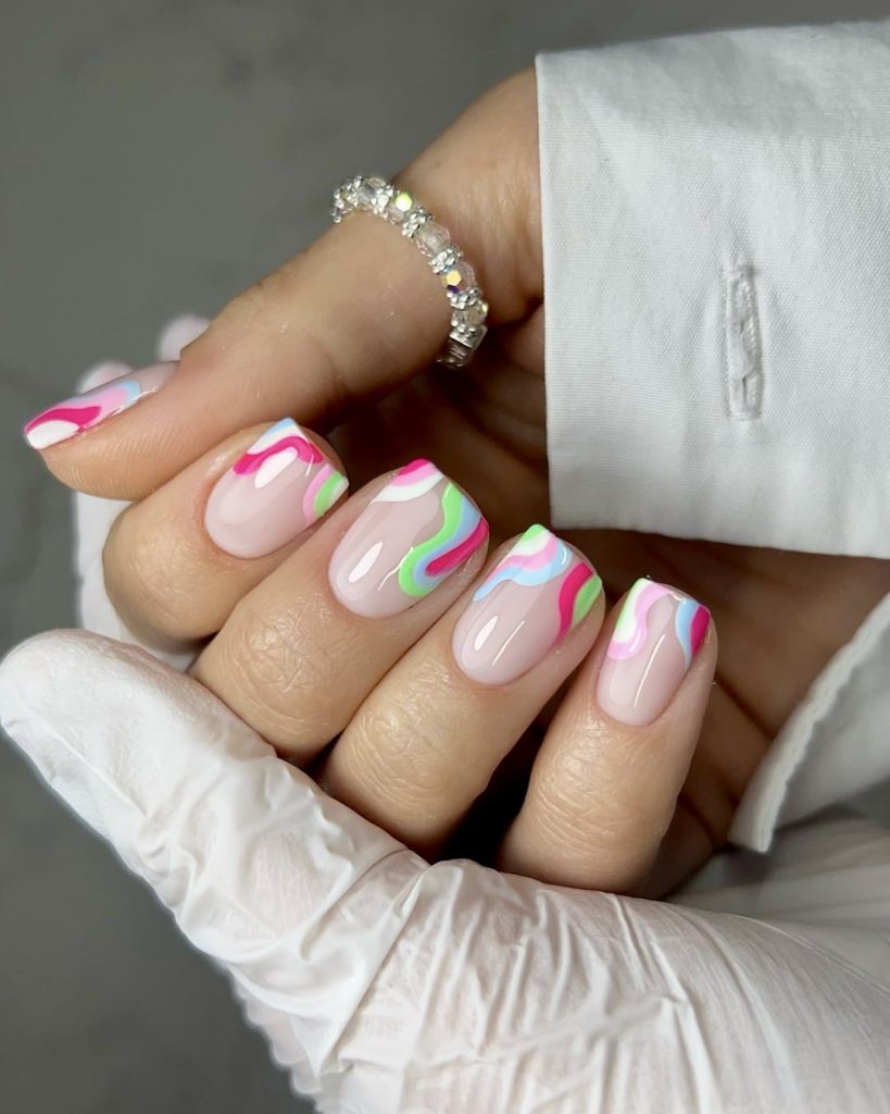 Here’s an abstract design that is absolutely funky and fun. Vividly colored pink, blue, green, and white swirling patterns on a nude transparent base create a bright splash of color which is only a little bit cool for casual use. This short square nail art seems to be especially for spring break or a tropical cruise. Not only is it surprisingly easy to combine with many outfits such as neon bikinis or pastel sundresses but it also really matches with everything. The design is aligned with a trend that reference listed influencers like Betina Goldstein frequently support: uncluttered, haphazard shapes that appear to be draft-like and unique.