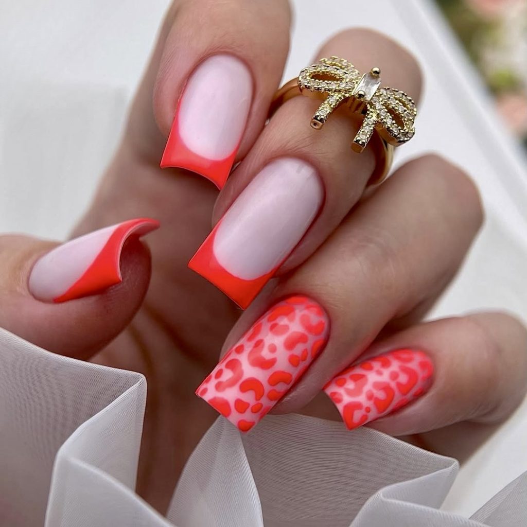 10. Bright Orange and Pink Animal Print French Tip