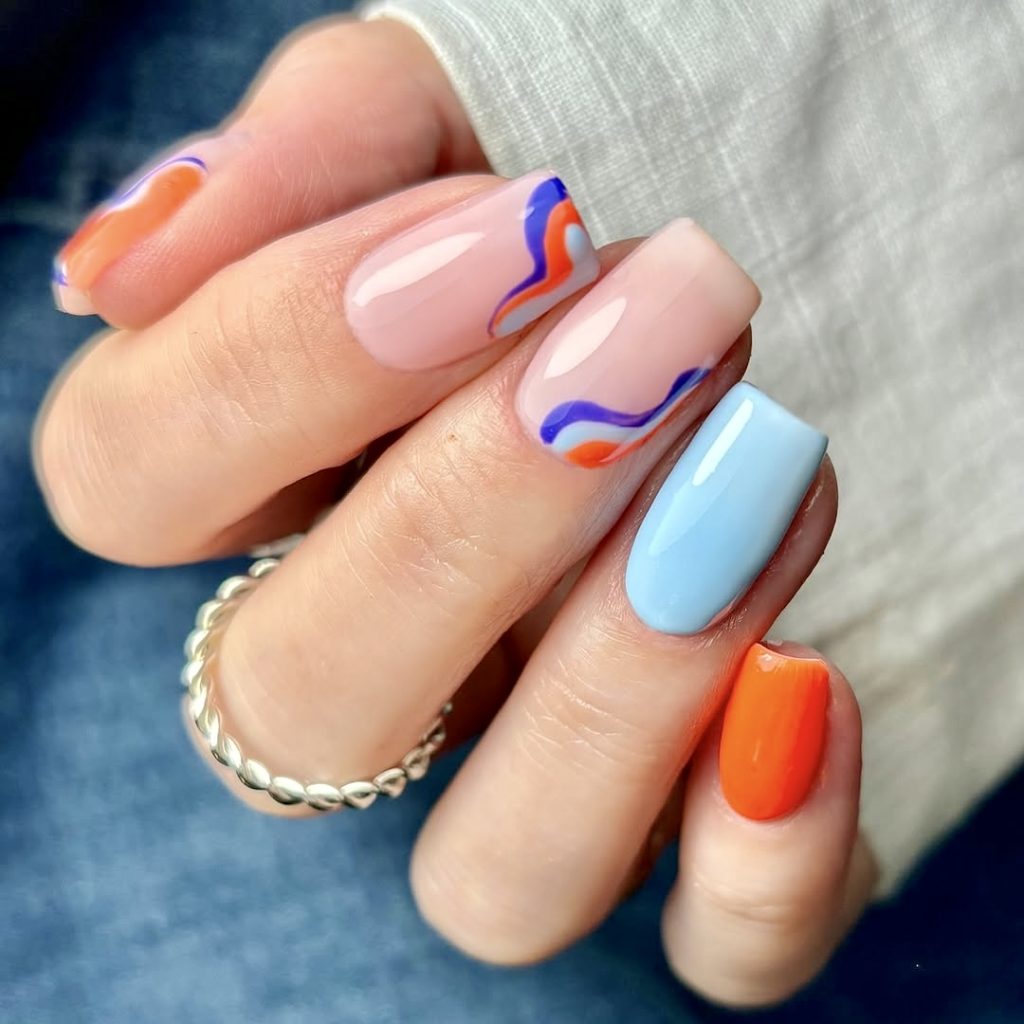 This vivid and multicolored nail art design utilizes bright orange, deep blue, and purple shades presenting flowing and abstract patterns on a transparent substrate. The design comes together by using the solid color of orange and medium blue for contrasting nails. It is a very dynamic style that gives off a feeling of lightness and creativity – it’s just perfect from summer music festivals to a day out in the city. It reflects the spirit of the blooming spring and the almost hot summer, the season of trendy tie-dye, and bright-colored clothes to fashionistas and fashionistas alike. It’s this particular kind of style that the nail_swag Instagram fashion influencers would find completely irresistible.