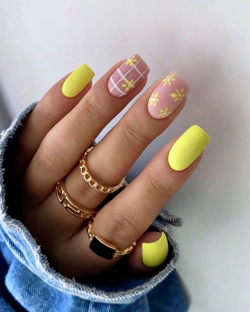14. Yellow and Pink Floral Matte Nails