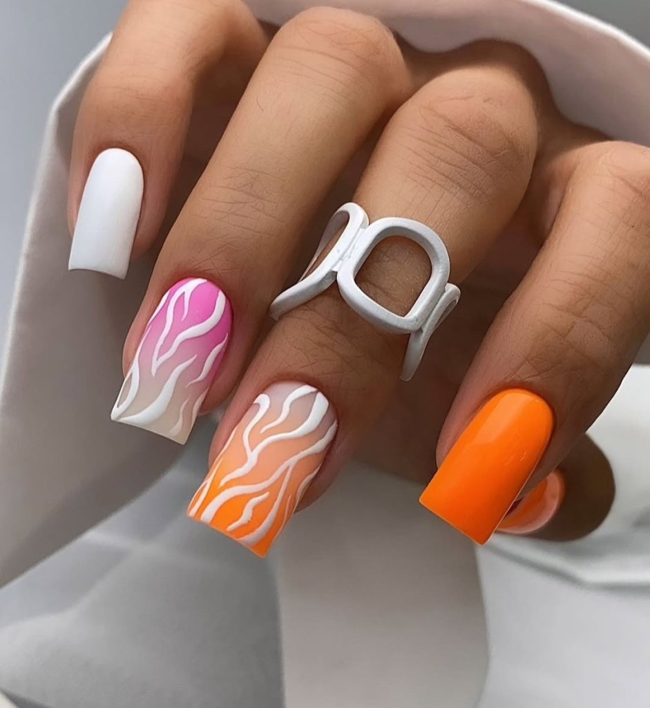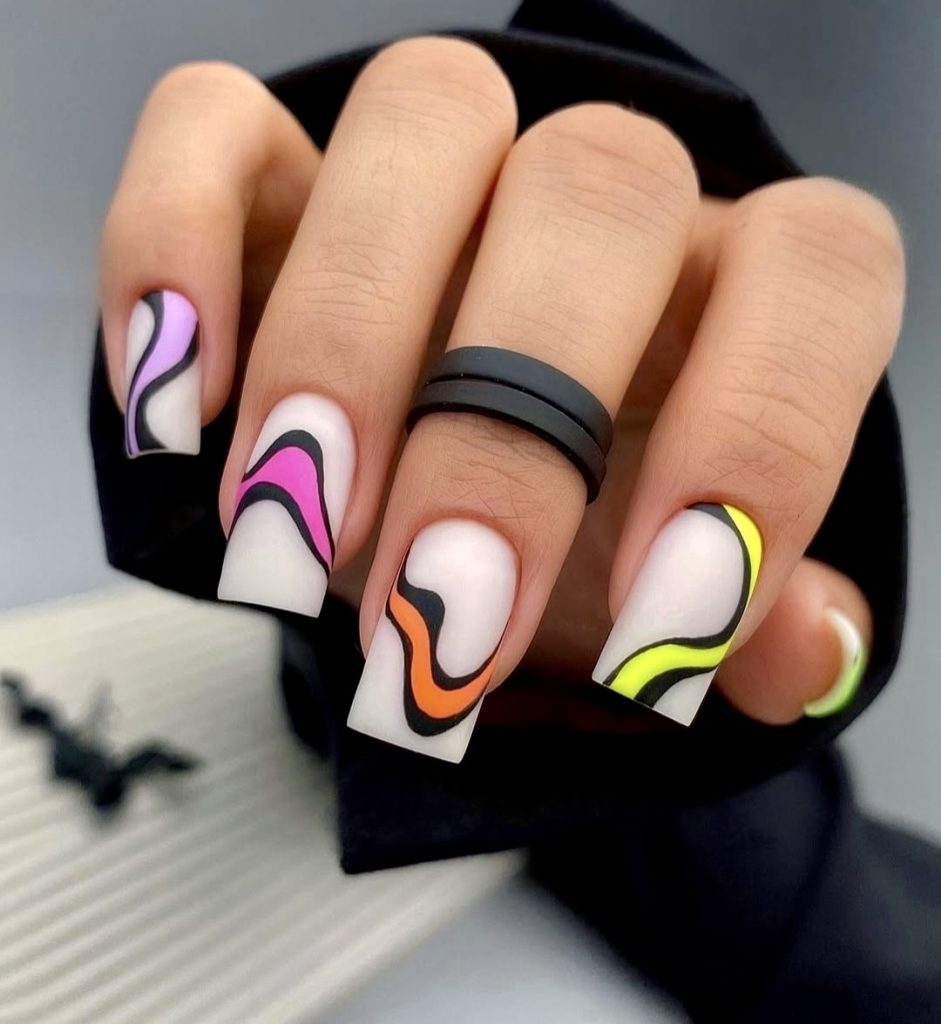 Having a bright summer day is not complete without this vibe! This outstanding style brings a matte white base and neon swirls in pink, orange, and electric yellow, with black edging the design for contrast. You will feel that each nail is the canvas of a miniature abstract style — just what you need for going to a music festival or lounging around at the beach. The square nails can be worn with eye-catching clothes or even with a minimalist monochrome version that gives all the emphasis to your fingers. This fun design spills the warmth and sunny spirit and feels like a throwback to the summer of 2025.