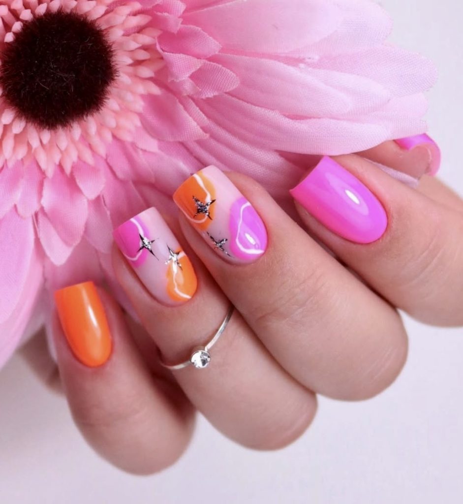 Orange and pink have got to be one of the best combinations all summer long. The superb wave patterns, in addition to the glittering silver stars, create an atmosphere of earth and cosmic fantasy. This square style of the nail is like a canvas for bright colors and is also very practical for someone with the idea of going to a tropical island. What’s more, it is top of the line with the glossy look, because of that the colors appear alive and it is a perfect choice for those who like to dress funky and for the imaginative person.