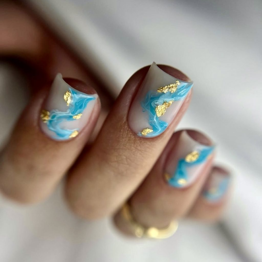 This medium blue and gold marble design is the best option for people who want to remain classy even in the hottest months. Swirling patterns of oceanic blue blend with delicate touches of gold foil, giving the nails a luxurious, high-end feel. It’s a look straight out of a magazine, ideal for cocktail parties, yacht events, or sunset beach dinners. The background is simple and natural, which makes the vivid parts of the design stand out without being too much, and so it gives a perfect place in the spring and summer style.