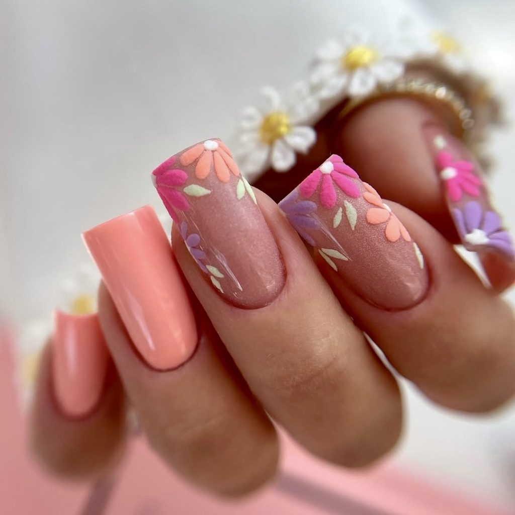 Florals lifewatchers never turn off the surface, and this recent approach appears to be specially designed for 2025. This design, with soft-colored multi-colored daisy-like flowers on pink matte tips and a warm orange base nail, literally showcases the unconcerned beauty of the season. The square form imparts elegance and the matte finish keeps it trendy. It’s a pretty and lovely design, multifaceted and thus suitable for brunches, bridal showers, or a day at the local flower markets which one can explore. For the entire girlish look, pair this manicure with soft pastel dresses and sandals.