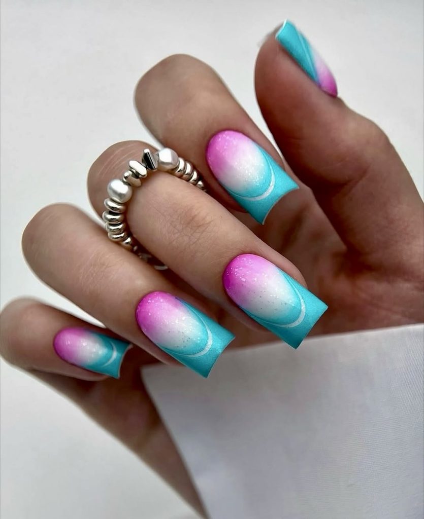 This eye-catching ombre design is the result of the comfort of a summer night sky as the source of inspiration. The dark blue, violet, and light pink colors, as well as sparkles are combined through a gorgeous ombre. The long square nails serve to complete the cosmic effect, which transforms them into dreamy accessories that are both ethereal and trendy. It is a perfect choice for summer evening parties, bonfire parties, or stargazing dates. In this way, the nails are interpreted as accessories and storytelling canvas — a universal idea for fashionable designers of 2025.