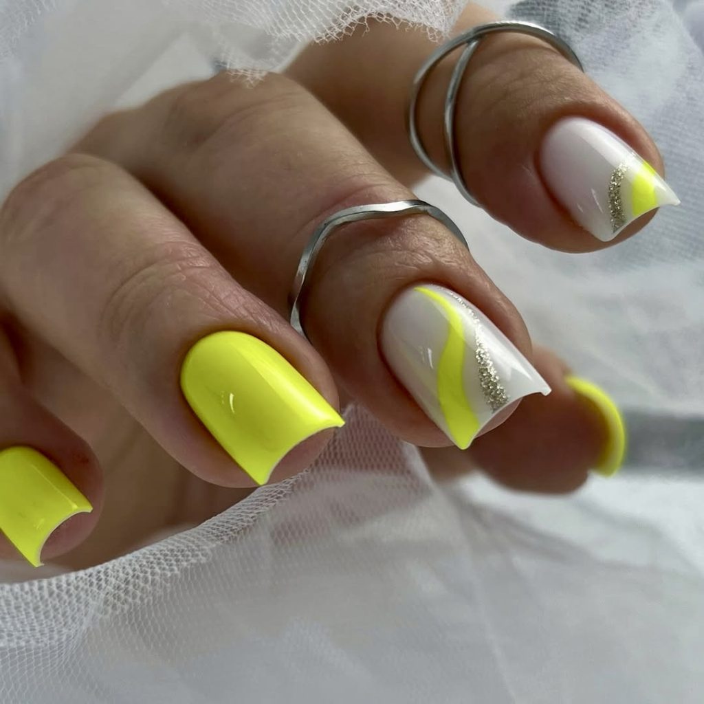 For electric color enthusiasts, this full neon yellow manicure is a great manifesto. The combination of purely neon nails along with artistic nude-and-yellow waves embellished with silver glitter is just fantastic. The rectangular form adds solidity and at the same time keeps the atmosphere easy-going. This design that feels breezy, lively, and absolutely earthly according to the season actually comes in handy for the summer 2025 festival, beach trip, and evening outings among the stars.