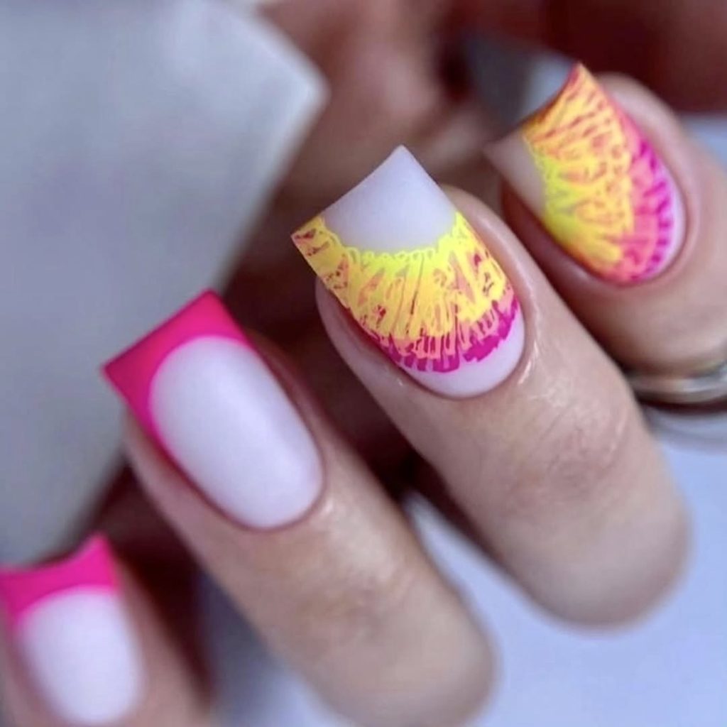 Be prepared to be the talk of the town with this electric combination of neon pink and sunny yellow! This daring and high-impact design consists of mojave matte neon colors in a contemporary geometric layout, which instantaneously gives the space both fun and futuristic feelings. The long and square nails further emphasize the drama, thus this look is just best for music festivals, rooftop parties, or tropical vacations. If you are a person who is not terrified by vivid colors nor afraid of showing your true self in the nail design, then this style must be included in your to-do list. This is the best summer nails 2025 -b road, light, and energetic- that you can imagine.