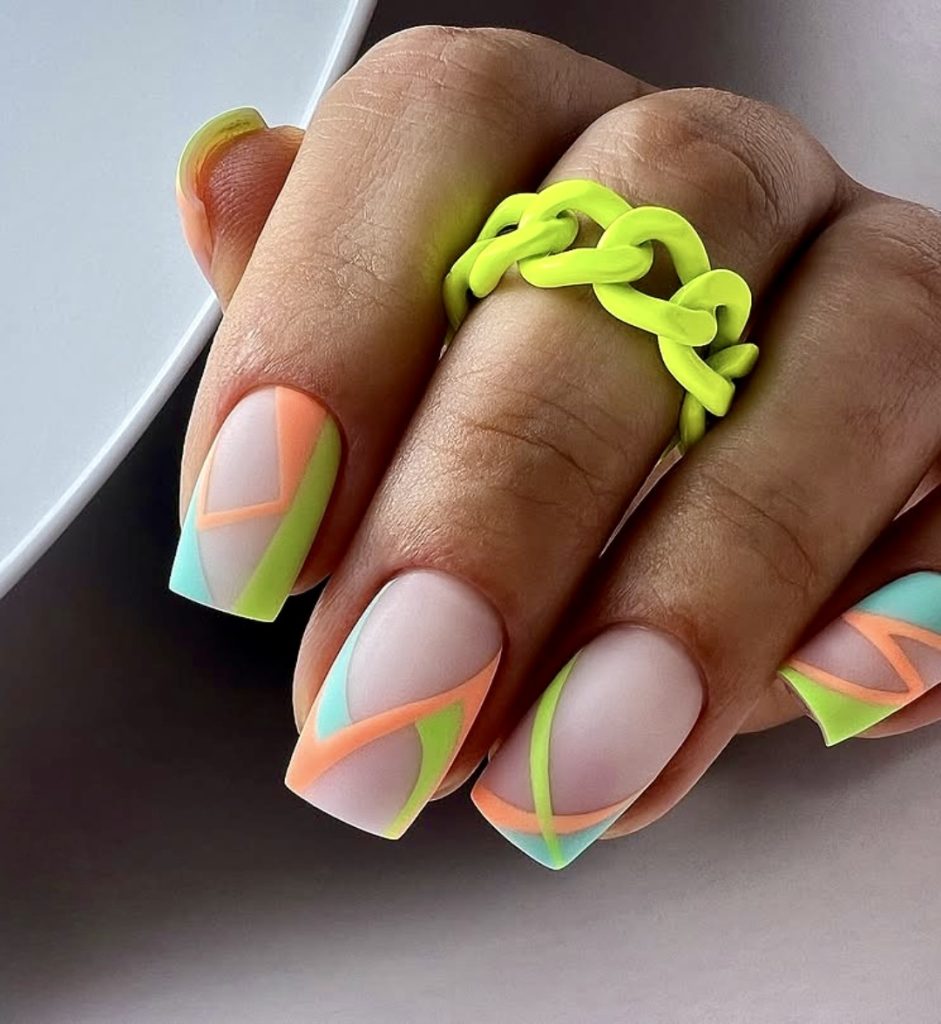 Go crazy with this vibrant, high-spirited animal skin design! Bright neon colors pink, yellow, orange, and electric blue are the base, whereas black spots are the contrasting color which makes it look very dramatic and fearless. These square nails of medium length are specifically meant for adventure like this: music festivals, rooftop parties, or simply when you want to express your inner wildness. Among the most tropical and bright styles you’ll spot on Trend 2025, these funky jewelry and color block outfits are excellent partners.