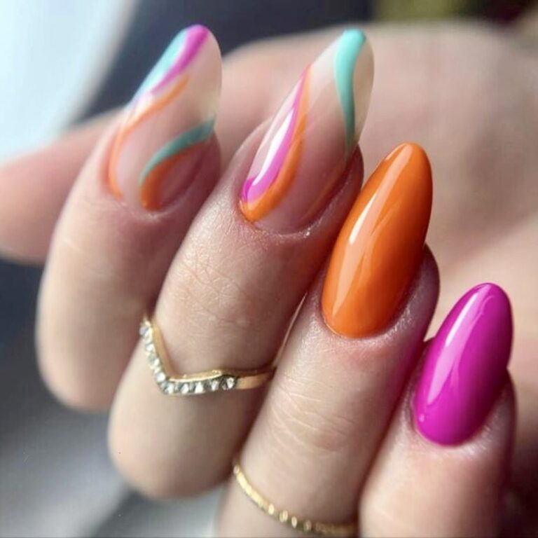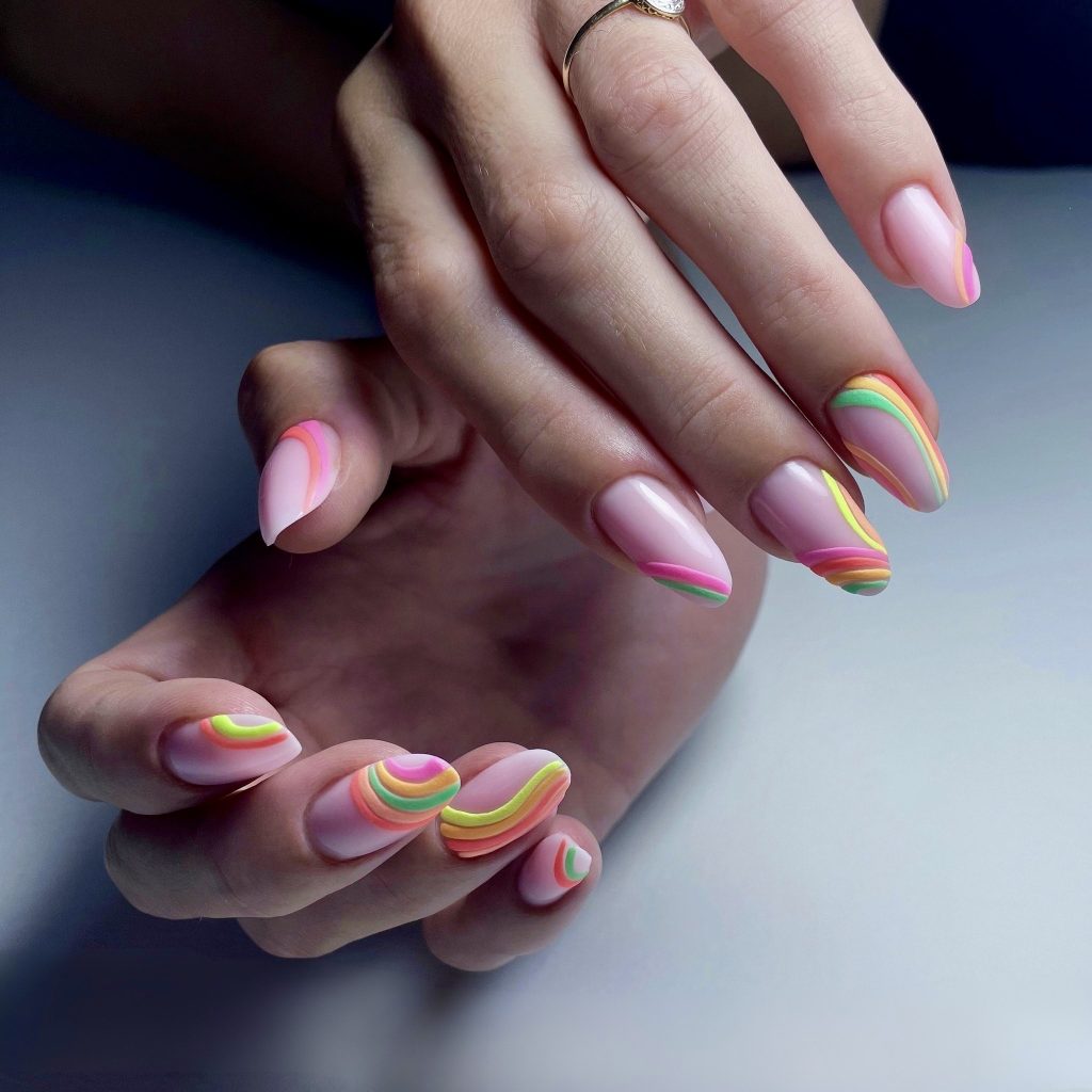 The design explodes with wild movement through neon pink, orange, green and blue intricate swirls dancing on bare fingernails. The result? A summer beach party meets retro-cool style. The design is an outstanding example of the art of optical illusion and groovy lines that represent the main trends of 2025. Summer almond nails reach their highest level of vibrancy to match all your energy this season.