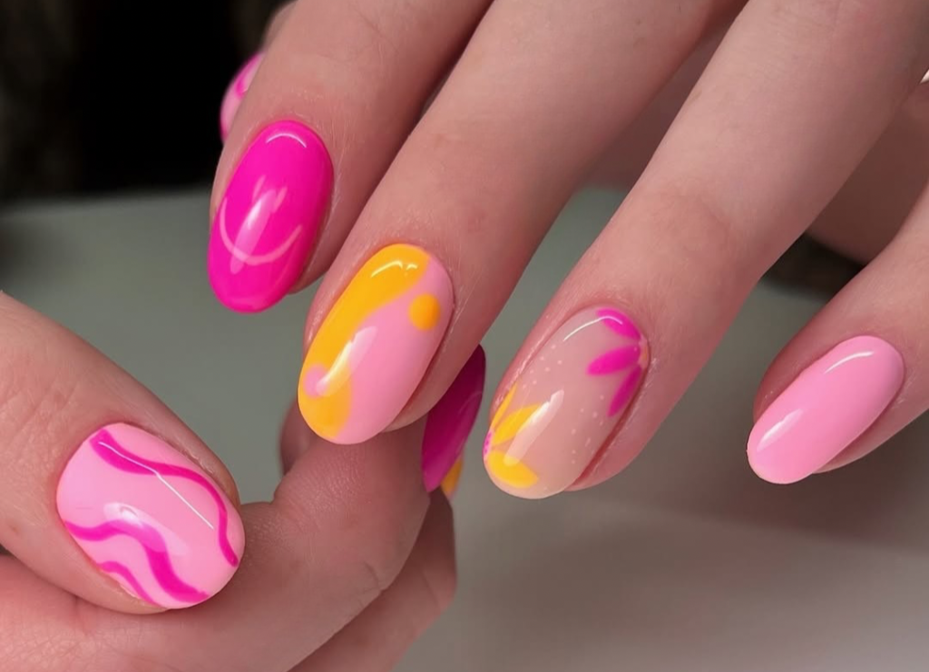 The playful summer drink aesthetic exists within the fluid pink, peach and lemon yellow brushstrokes that are delightfully appealing to the touch. The design reaches its peak in the way it plays solid neon colors against abstract vibrant summer nail floral accents with individualized ring finger petals that replicate homemade touches. The almond-shaped nail makes this bold color combination flexible enough to be worn both day and night. Those who enjoy pink hues along with sunset tones will easily fall in love with this tropical manicure for its balanced visual appeal.