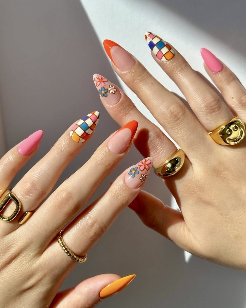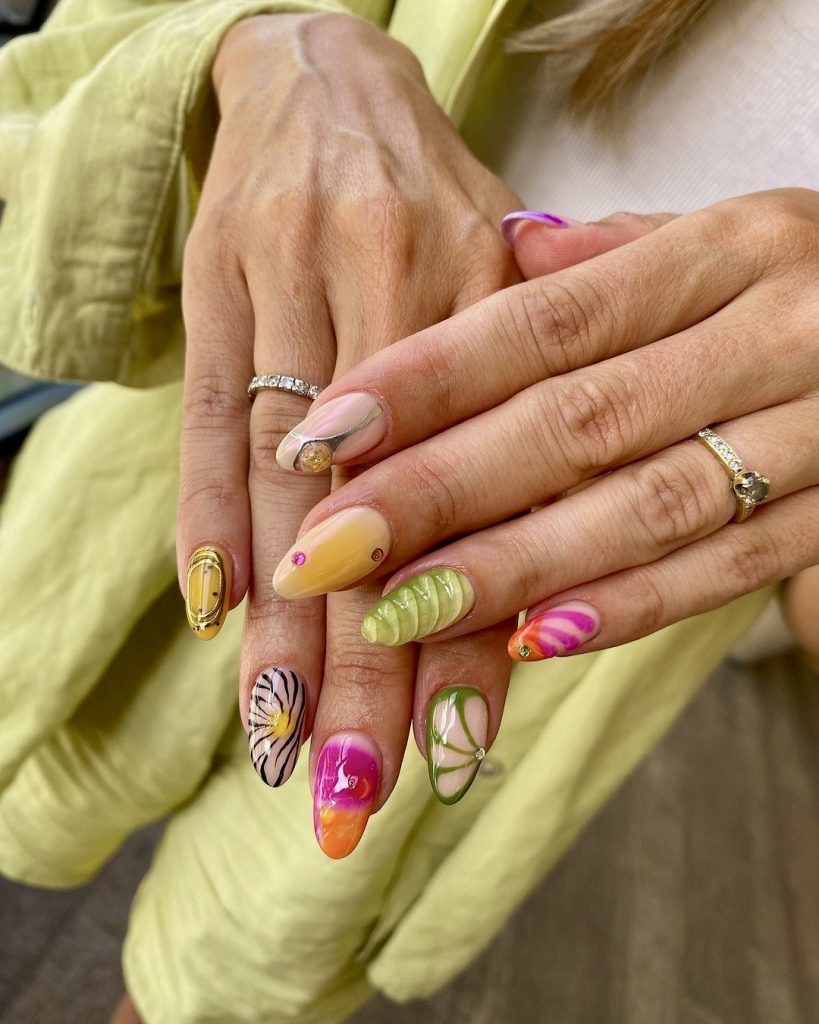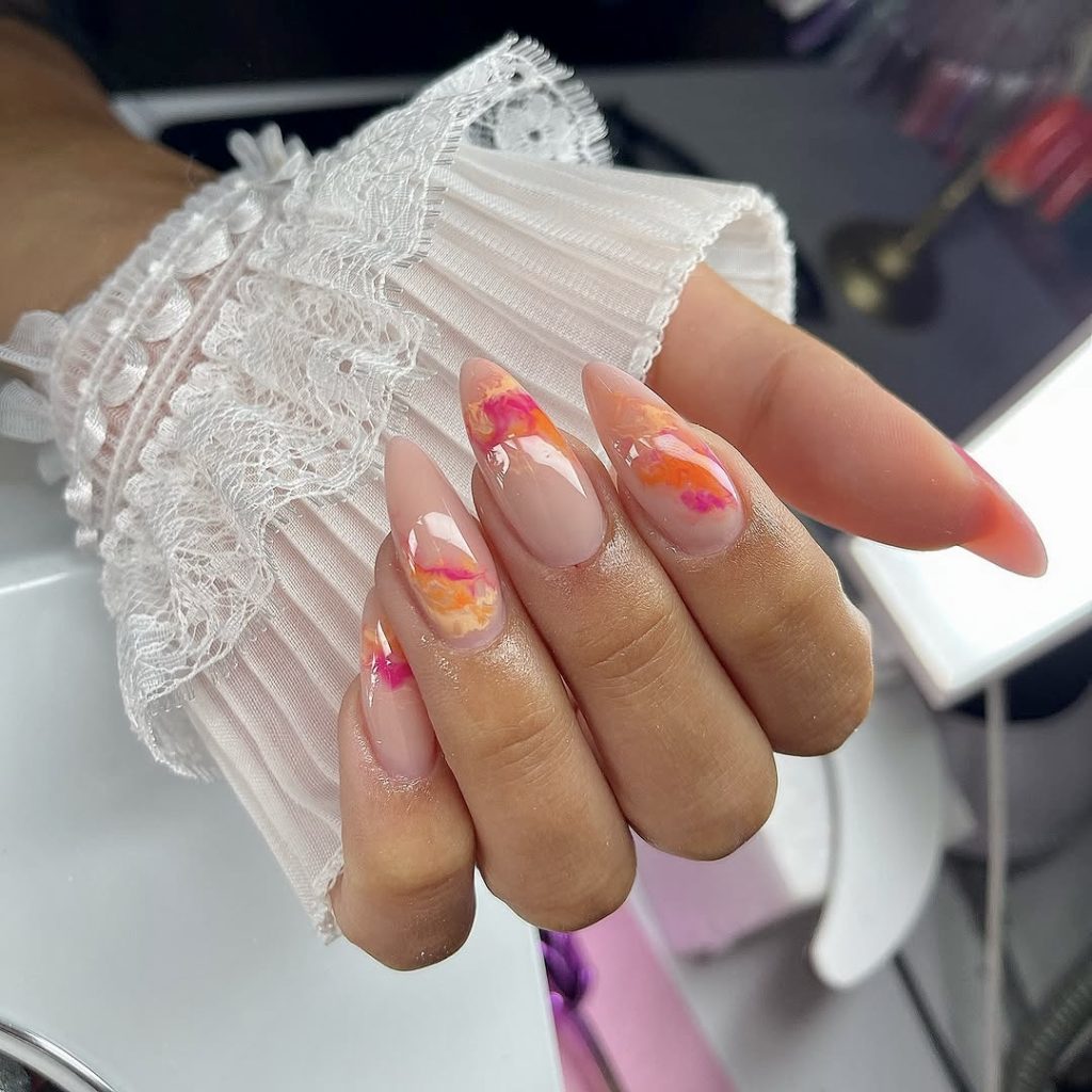 Summer almond nails vibrant combine flower power elements with swirling patterns in bright violet and bubblegum pink, orange and yellow hues. Artistic brushwork on a variety of backgrounds creates a 1970s festival spirit. This design suits the imaginative style of people who enjoy colorful outfits, as it can be paired with a farmhouse crop top, big sunglasses and platform shoes. Total vibe.