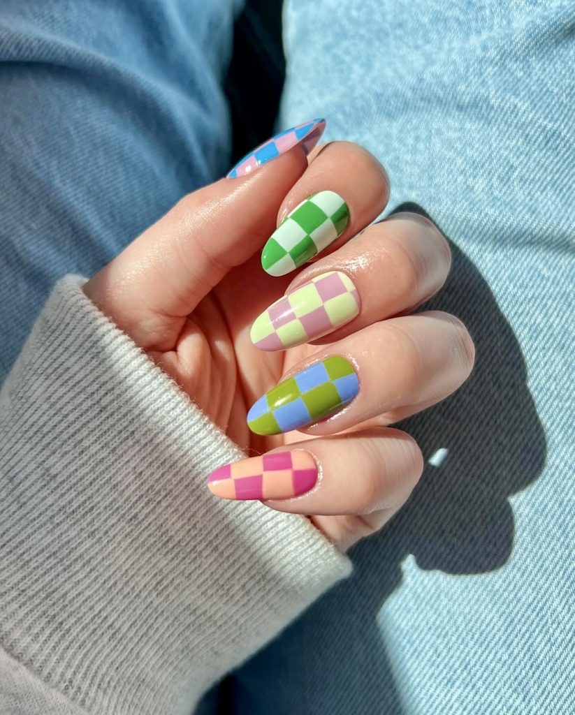 The checkerboard nail style shows no signs of fading away in 2025 as the pastel design adds a modern twist. This checkerboard of blue and mint green with soft lilac and coral peach is a playful styling choice that remains elegant. This manicure design works beautifully because there are different combinations on each finger, giving everyone the opportunity to mix and match cute and quirky fashions. You can achieve a trendy and stylish cool girl look by wearing these nails either with a denim jacket or a pretty pastel two-piece set.