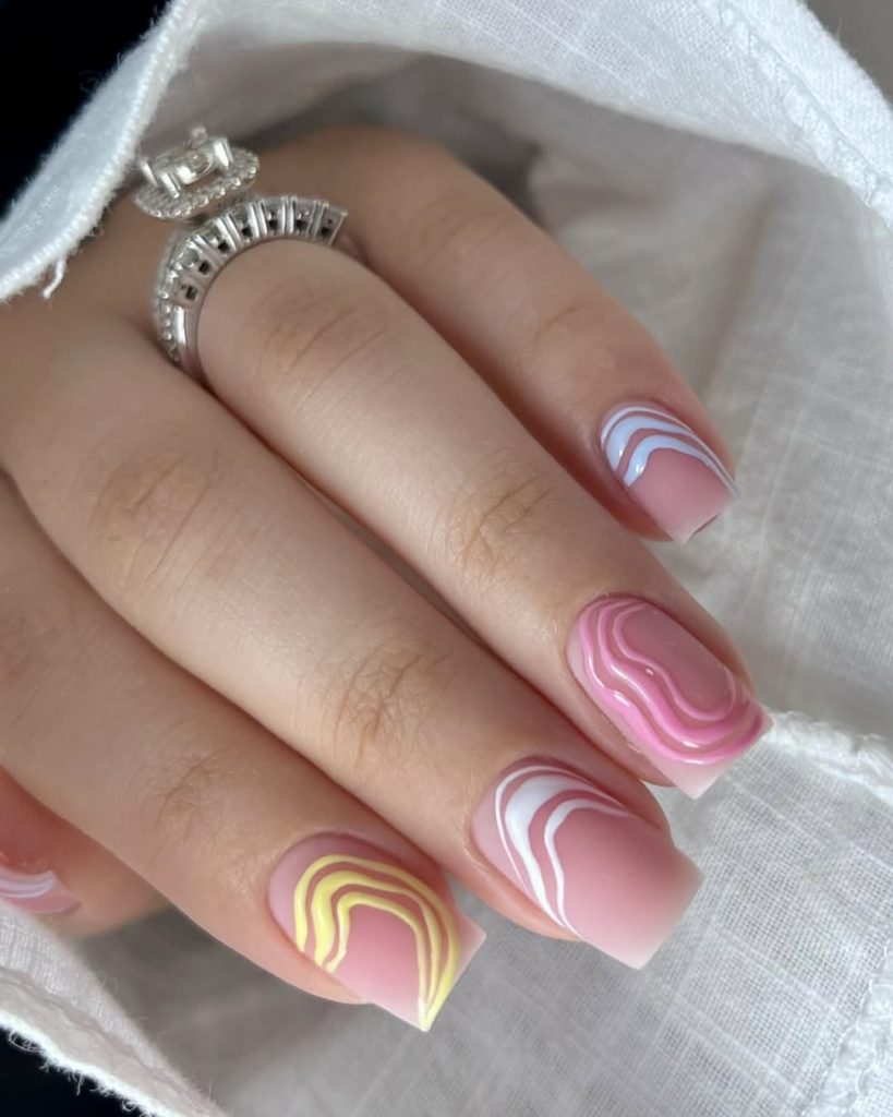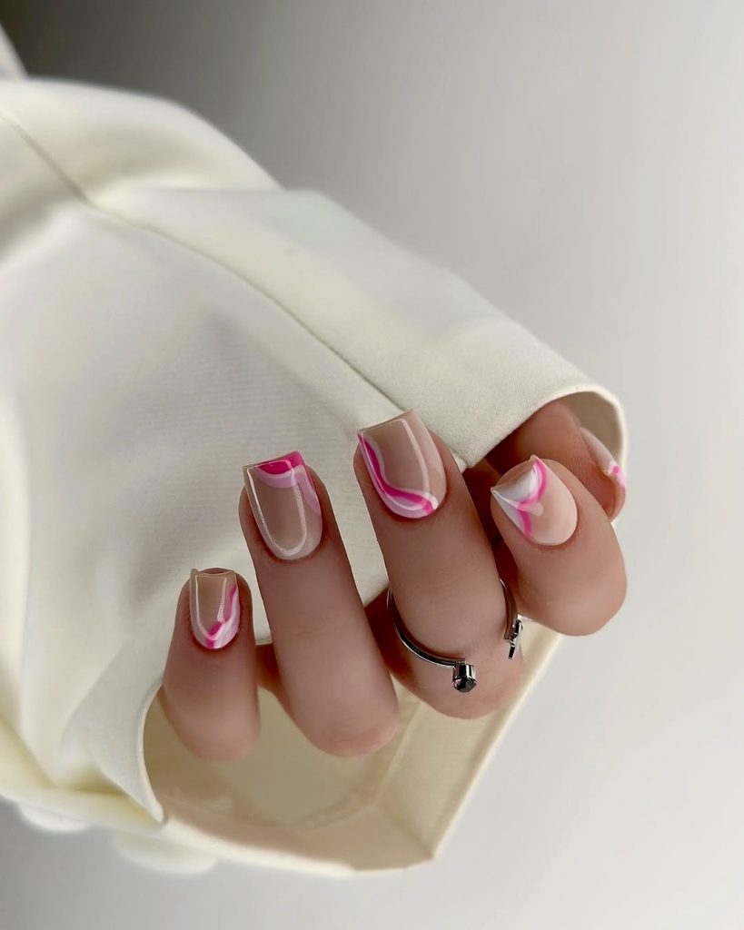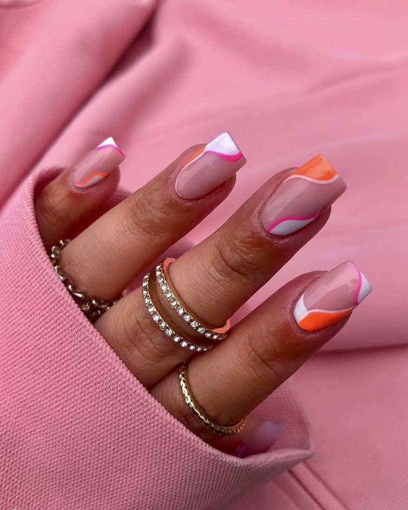 A sleek square design features minimal swirls of orange, white and pink over a glossy nude background, creating a modern yet distinctive 2025 short nail design. The curved lines in this design create a relaxed, effortless look reminiscent of the pleats in a summer dress. Although the color blocks are clean and bright, they provide a fun summer manicure that maintains a sophisticated look. The manicure works great with blush clothing and delicate gold jewelry to create an elegant warm-weather look.