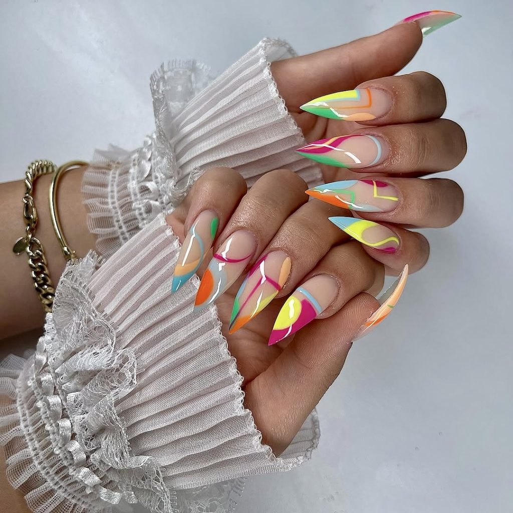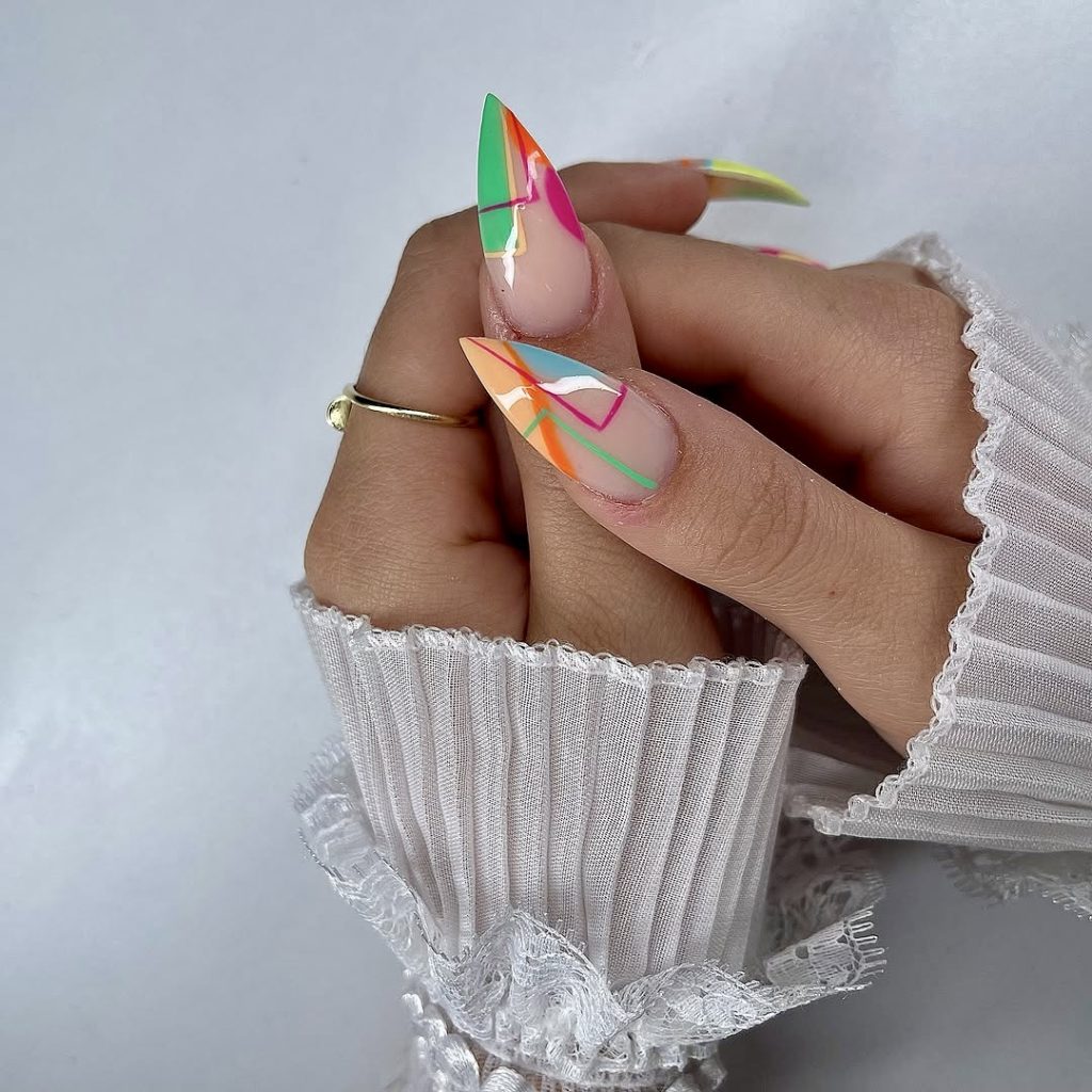 An edgy French tip gets an artistic makeover when you add geometric shapes in shades of green, orange and hot pink to the tips of pointed, almond-shaped nails. The transparent base beneath the lines presents a clean surface that enhances the sharp geometric shapes that rise above. Tasked for individuals who want architectural flair in their summer nails due to its structured bold design. The sleek nail designs become the focal point when paired with minimalist clothing as they become the main accessory.