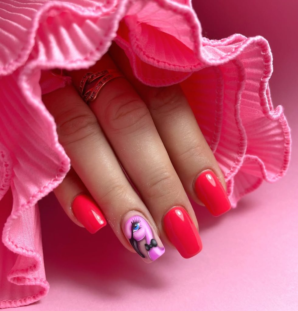 This nail design comes with a bold pink nail polish, but also features an unusual cartoon flamingo with eyelashes and a bow tie on one of its nails. This summer manicure embodies all of the cool summer beauty attributes as it shows a playful spirit with vibrant colors. This manicure style realizes pop art and nostalgic vibes as it recreates a poolside fashion statement, but with a mischievous twist. This manicure design is for trendsetters who are confident in their playful personality for the year 2025.
