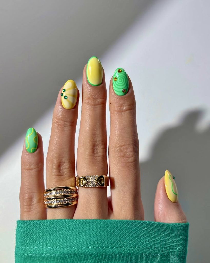 The vibrant yellow and colorful green coating of this manicure delivers an energetic punch full of personality. Each nail is given a unique twist with metallic beads and 3D swirl techniques that hold the cohesive design together. The combination of green and yellow creates a cheerful look, like a refreshing citrus drink in the summer heat. The sporty streetwear and neon tank combination works perfectly with these 2025 almond nail styles.