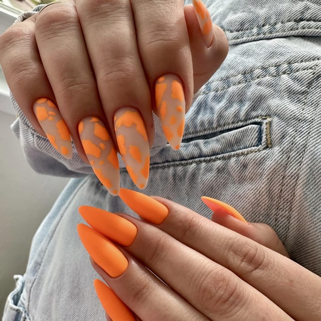 A contemporary finish creates this bold matte orange collection that introduces abstract cloud patterns into its design. The almond-shaped pointy design maintains its edgy appearance, which is balanced by the fuzzy pattern with enough softness. The summer nail color stands out as a powerful statement that suits confident women who want a fashion-forward polish for their everyday outfits, including denim jeans and blazers.