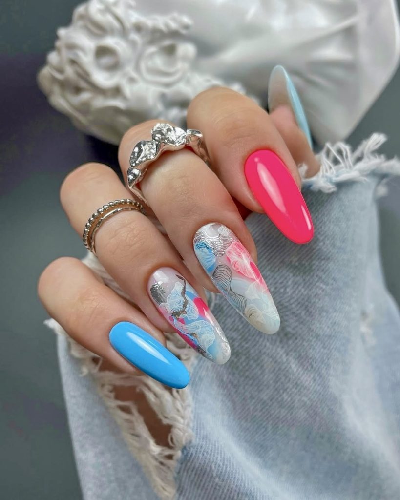 The dreamy manicure in soft blue and hot pink with silver florals creates an enchanting fairytale effect that captivates all who see it. This almond-shaped nail design showcases effortless floral patterns due to its length, which matches vibrant summer flowers with an enchanting quality for ladies who love floral styling. This manicure creates a romantic presentation with detailed work and a balance of cool and warm tones, making it perfect for any occasion, including everyday wear.