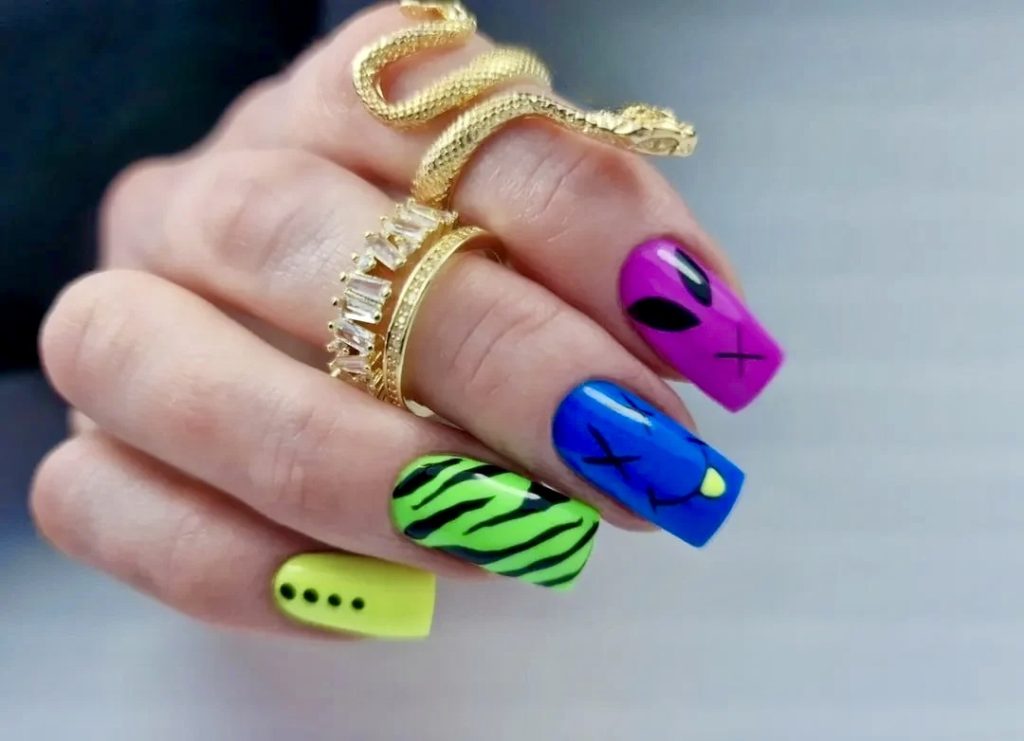 The zebra striped green with electric blue smiley faces and pink alien imagery on these nails creates a cartoon-inspired total attitude expression. The squoval shape provides organization that creates visual harmony between the disordered elements and elegant appearance. Bold individuals can embrace winter warmth with these vibrant summer color nails that blend retro gaming personality with rave culture flair and cutting-edge fashion elements. For the complete vibe, pair oversized sunglasses with statement rings when wearing this design per the style tips.