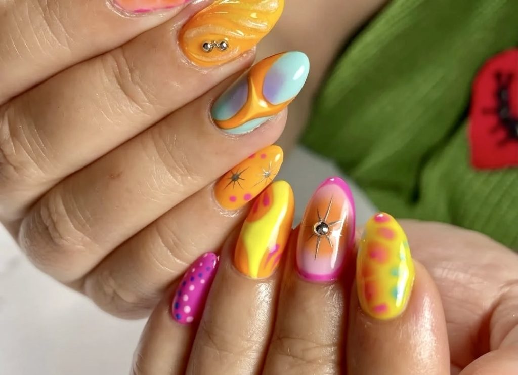 The manicure mixes bubble heart shapes and curved lines through blue with lime blue and lavender next to orange on small almond nails, showing cheerful colors together. Such intricate nail art evokes happy memories of the Y2K era, which looks like a combination of Y2K and Crayola colors. The manicure features an array of yellow and blue color combinations that combine fashion appeal with everyday practicality. Cartoonish nail designs create a high-energy aesthetic that suits people looking for summer adventures with buddies, casual brunches or outdoor excursions.
