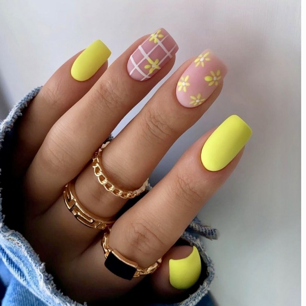 The playful yet sophisticated look of this set is created by combining checkerboard patterns with three-dimensional flowers, two of the top nail trends for 2025. One side of this design offers a retro appeal with pink, orange and blue checkerboard patterns before transitioning to colorful floral elements that create a three-dimensional effect. The vibrant flower-shaped summer nails are perfect for sunny outdoor occasions when paired with yellow gold rings and flared dresses.