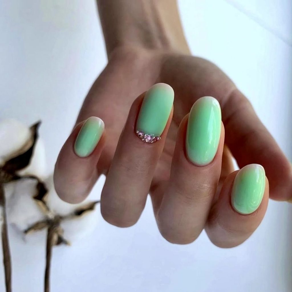 This mint colored manicure creates the same refreshing effect as drinking a cold mint lemonade in the hot sun. The vibrant summer nail solid color design strikes an elegant and cheerful balance, while the ring finger crystals add just enough decorative effect to enhance the look like nail jewelry. This attractive nail shape is perfect for 2025 short nail enthusiasts who want vibrant color without going overboard. The manicure is both sophisticated and vibrant enough to suit weddings, brunches and everyday events where elegance and brightness are key.