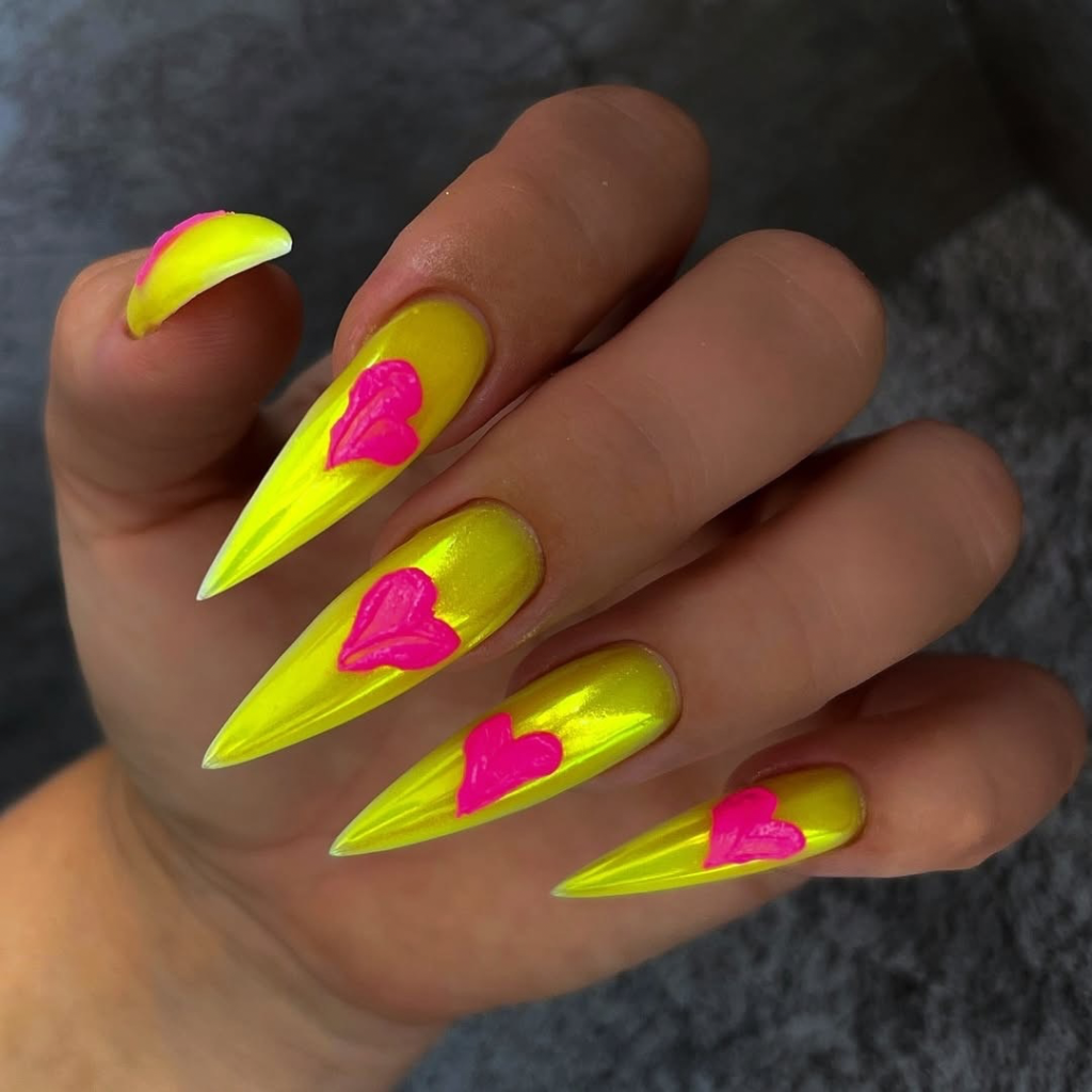 The electric look with its high-voltage appeal is made for dramatic people looking for a wow factor. This neon yellow base blasts with electric energy, but hot pink hearts above the surface create an eye-catching texture like plump three-dimensional hearts. Its outrageous charm combined with its strong personality makes this nail design perfect for poolside events and nighttime socializing, as well as any setting where the main character needs to be charismatic. The stiletto shape enhances the overall attitude.