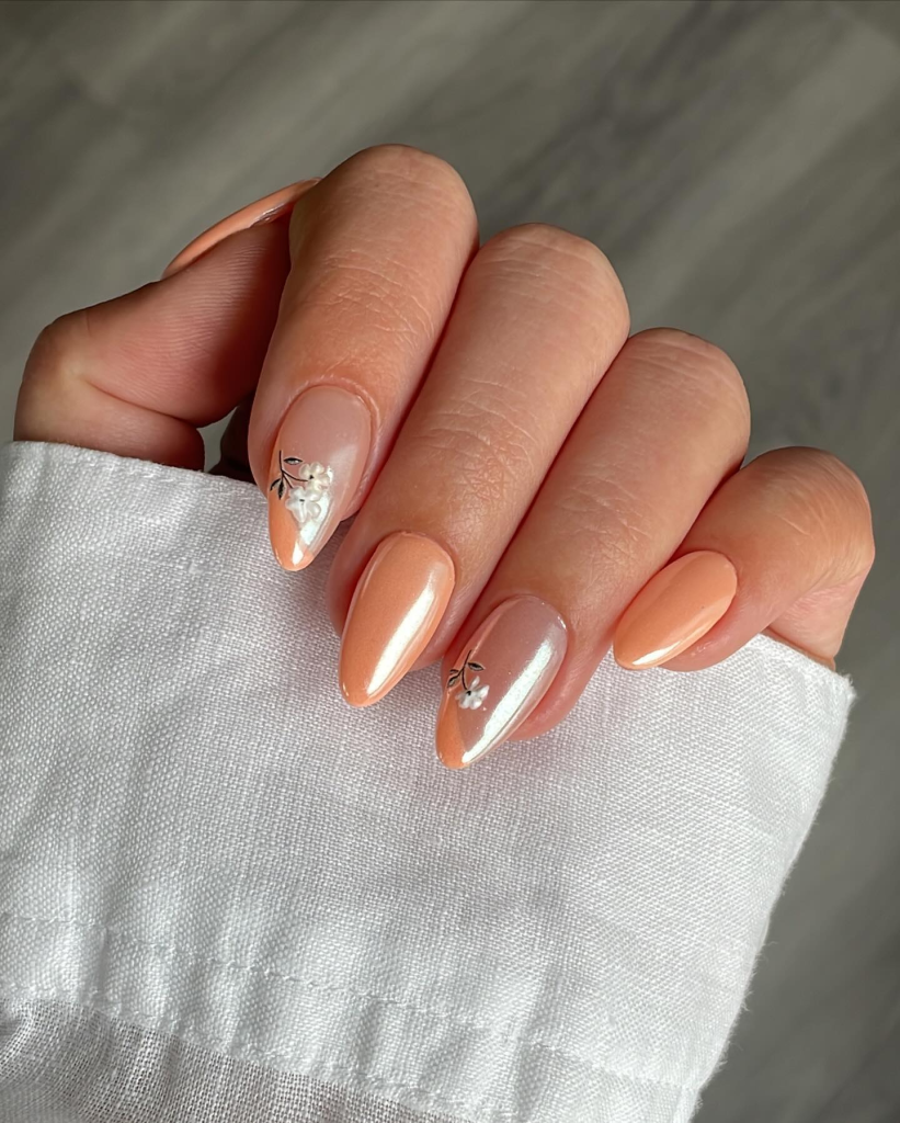 The prom chic peach almond nails are a style that speaks of some simple elements of elegance. A soft peach shade will bring you a fresh, vibrant look complemented by the wedding dress of your choice, and the brilliant contrast will not let somebody see as if you had too much. The tiny flowers print on these nails is a symbol of playfulness and tender womanhood, thus you can easily wear these beauties if you are invited to a wedding and you seek to dress both stylishly and simply. It’s a look that almond nails lovers can adapt and enter the runway at the same time.